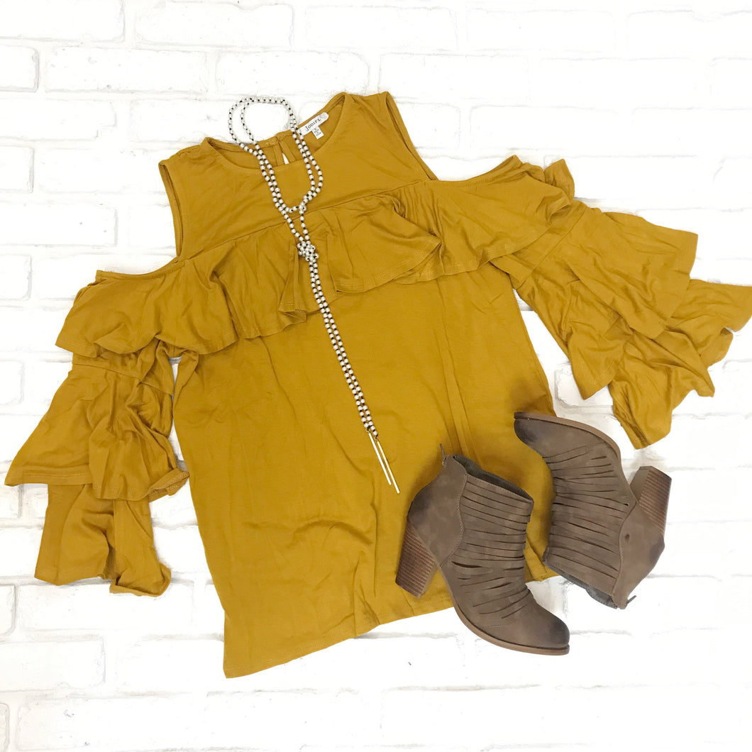 This color is so fun and you have to love the tiered ruffle sleeves! Cold shoulder detail on this lightweight, buttery soft top! Runs True! (100% Rayon)